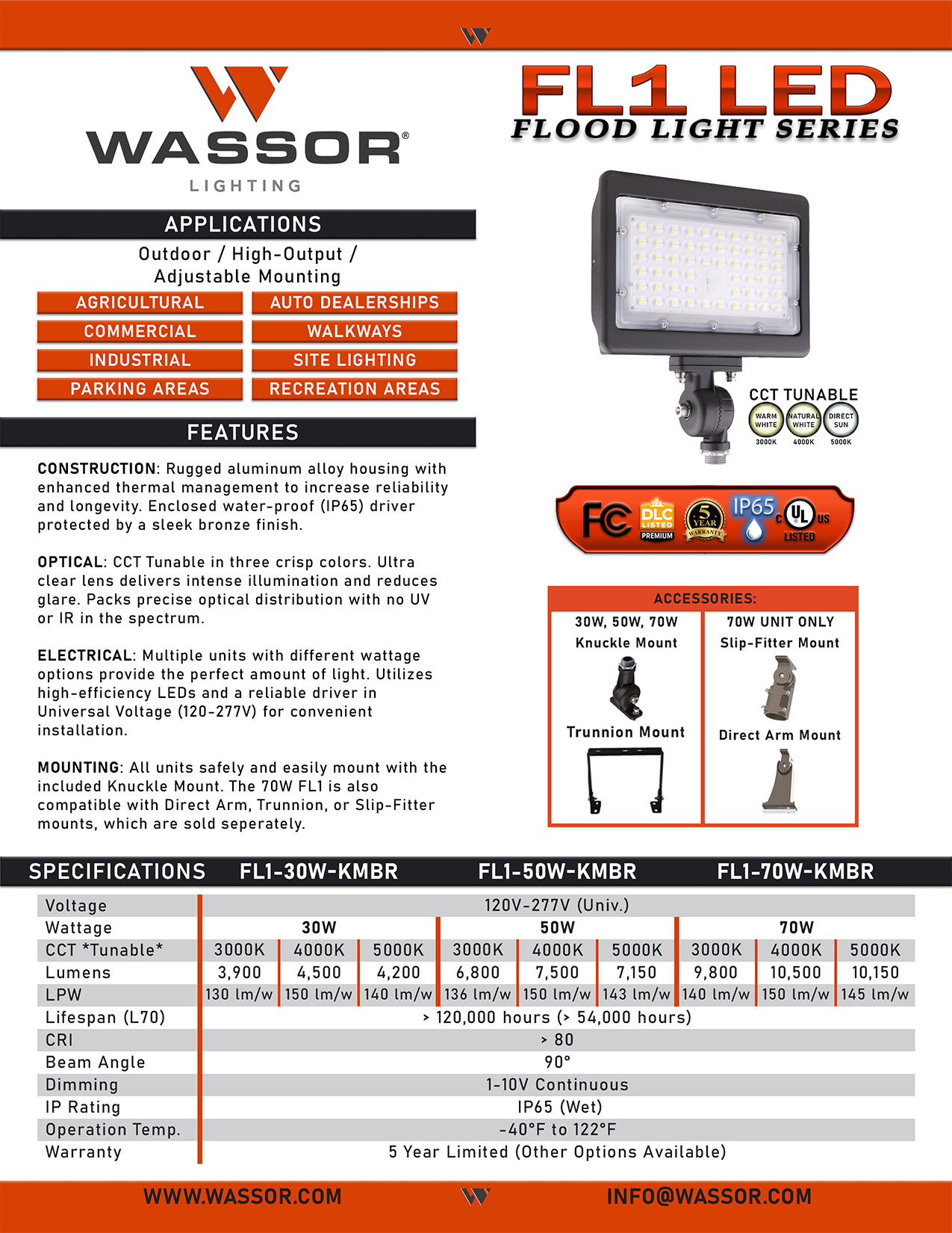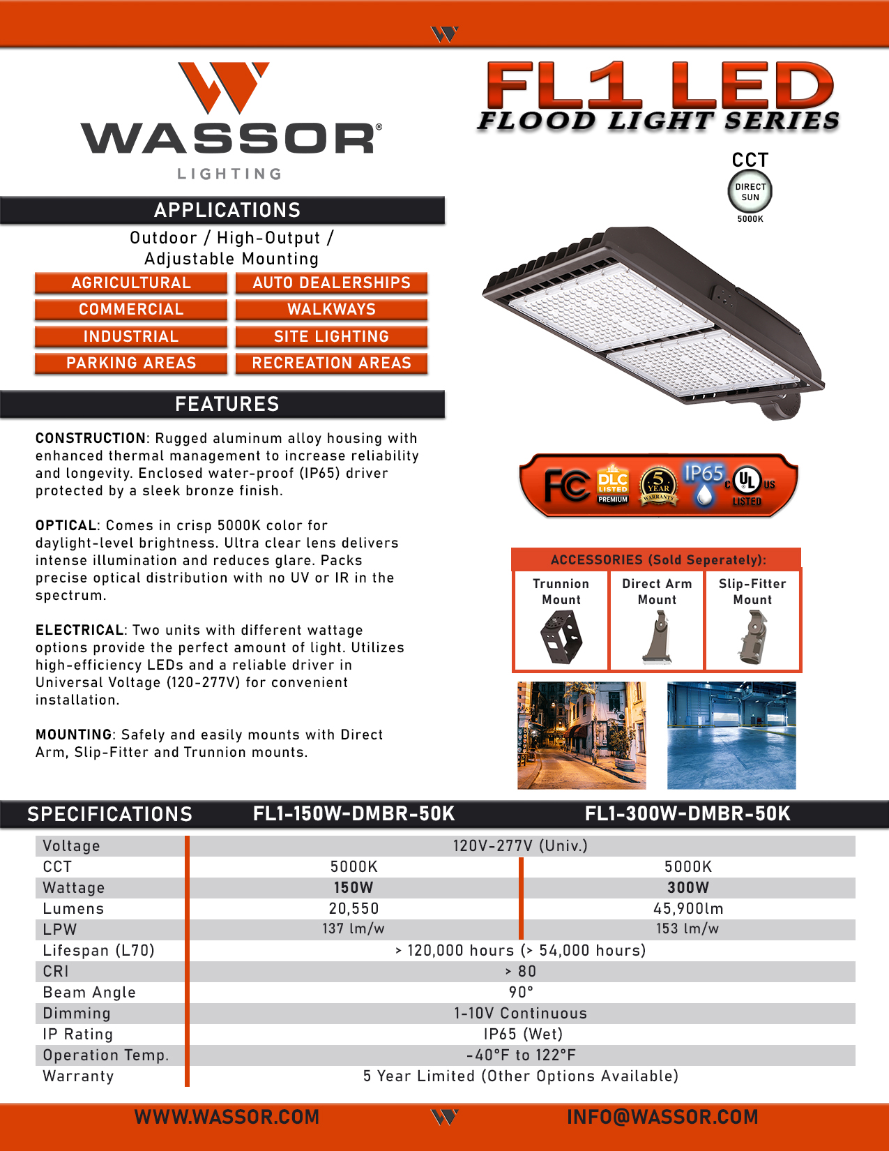 Meet the Wassor FL1 Flood Light – an outdoor powerhouse spanning agricultural, commercial, and industrial domains. Crafted with a rugged aluminum alloy housing and advanced thermal management, it guarantees reliability. CCT tunability, and fixed 5000K models with ultra-clear optics deliver intense, glare-free illumination. With multiple wattage options and high-efficiency LEDs, these versatile lights reign supreme. Safely mount with Knuckle, Direct Arm, Slip-Fitter, or Trunnion mounts. Illuminate with FL1 – where adaptability meets radiant precision.